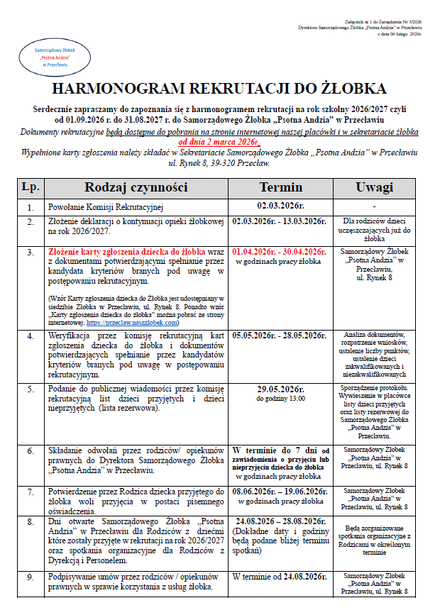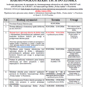 Serdecznie zapraszamy do zapoznania się z Harmonogramem Rekrutacji na rok szkolny 2026/2027 czyli od 01.09.2026r. do 31.08.2027r. do Samorządowego Żłobka „Psotna Andzia” w Przecławiu.
